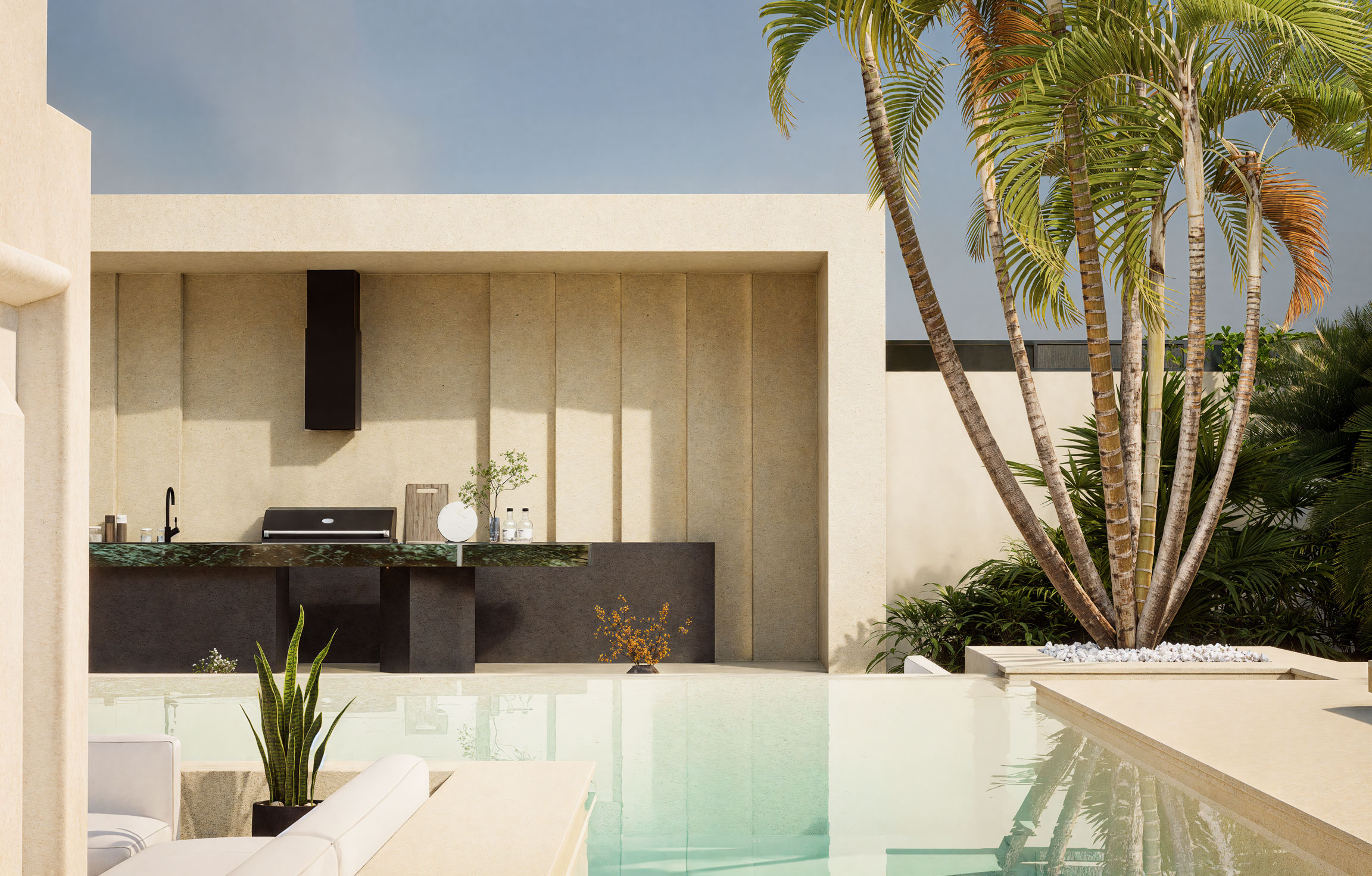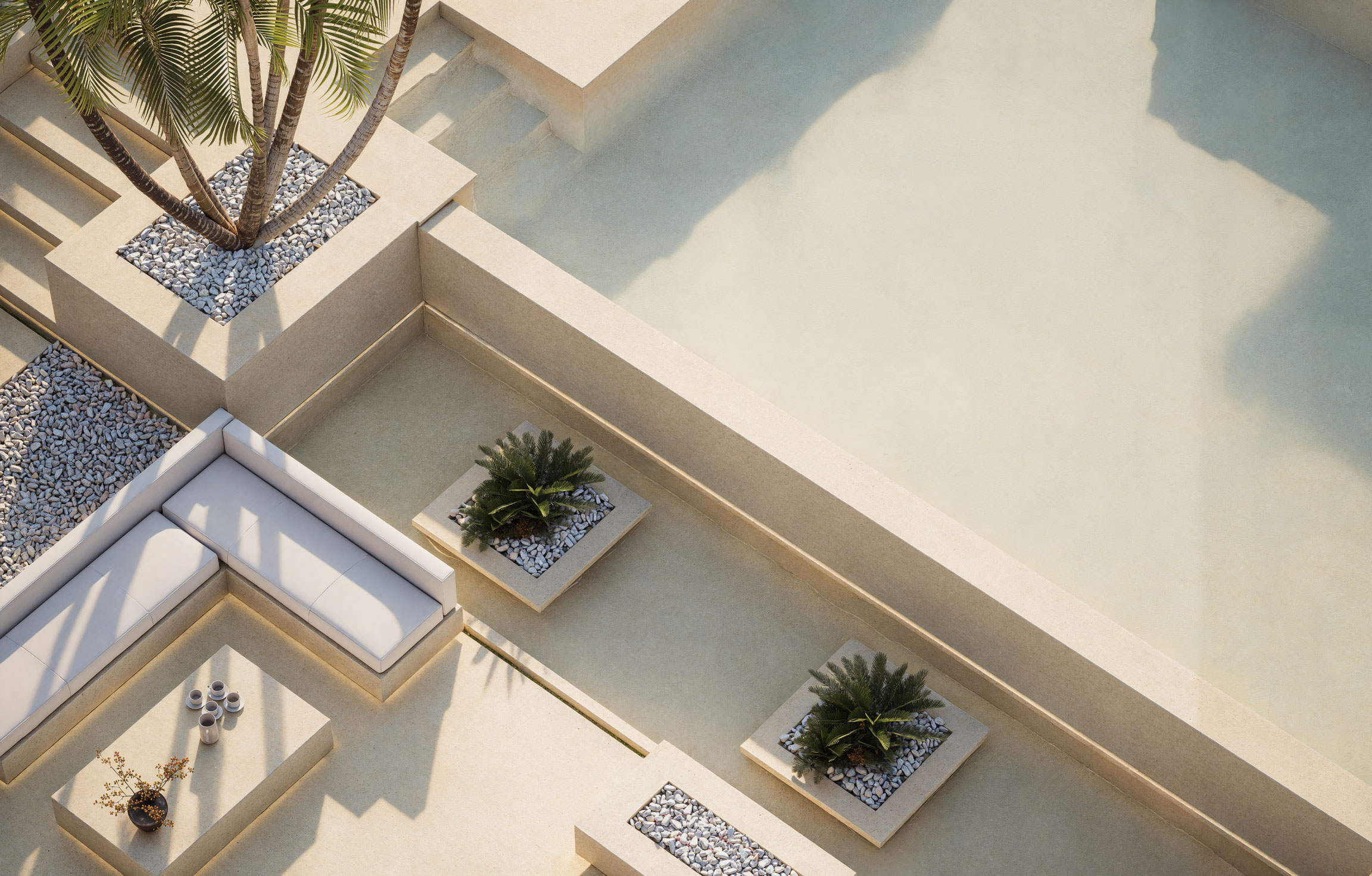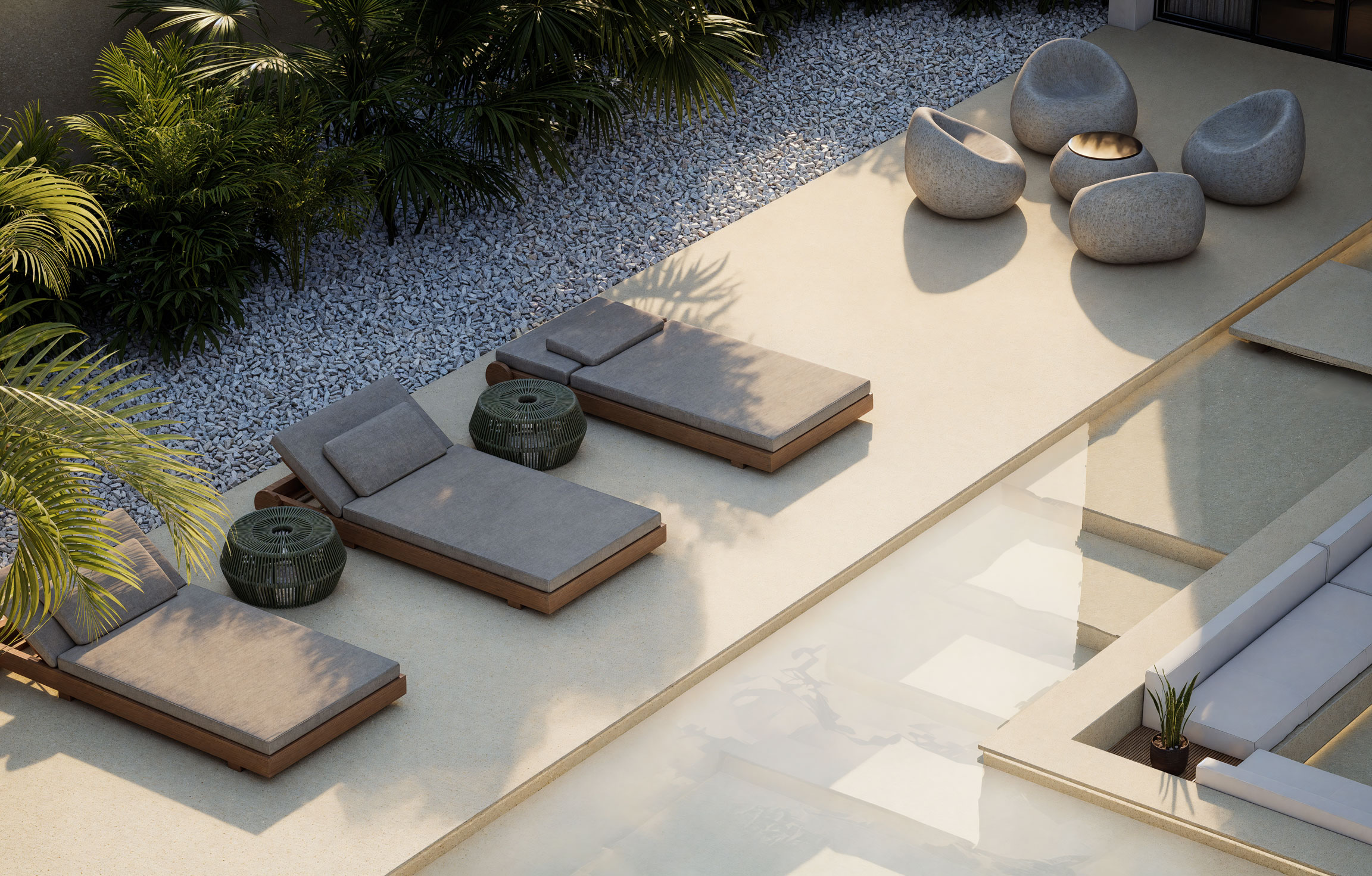 At the villa’s center, a reflective water surface captures shifting skies and soft light, turning every façade into a living canvas. This still mirror becomes both a spatial and emotional anchor, an element that draws the home into dialogue with its surroundings while embodying the essence of balance.