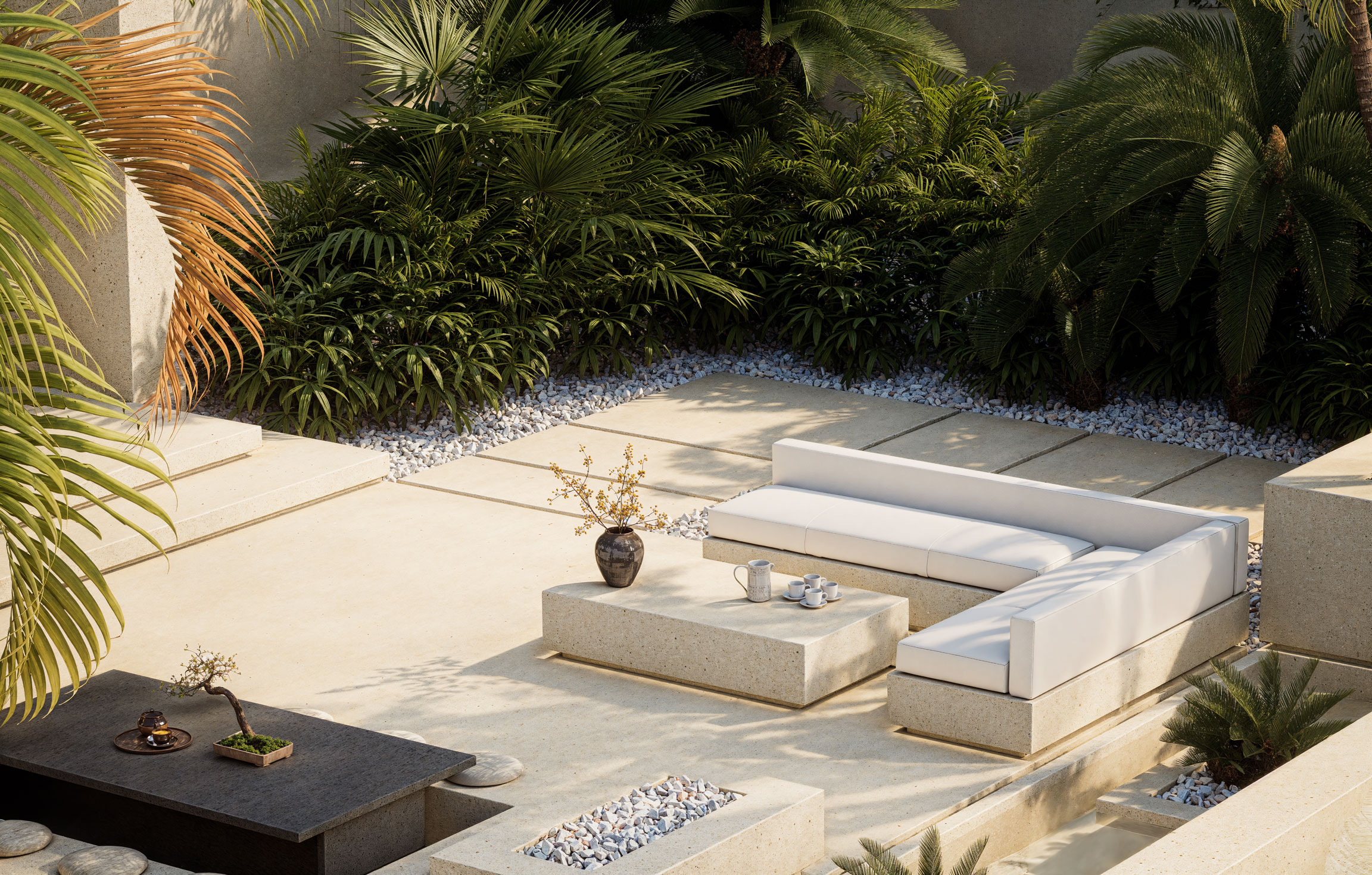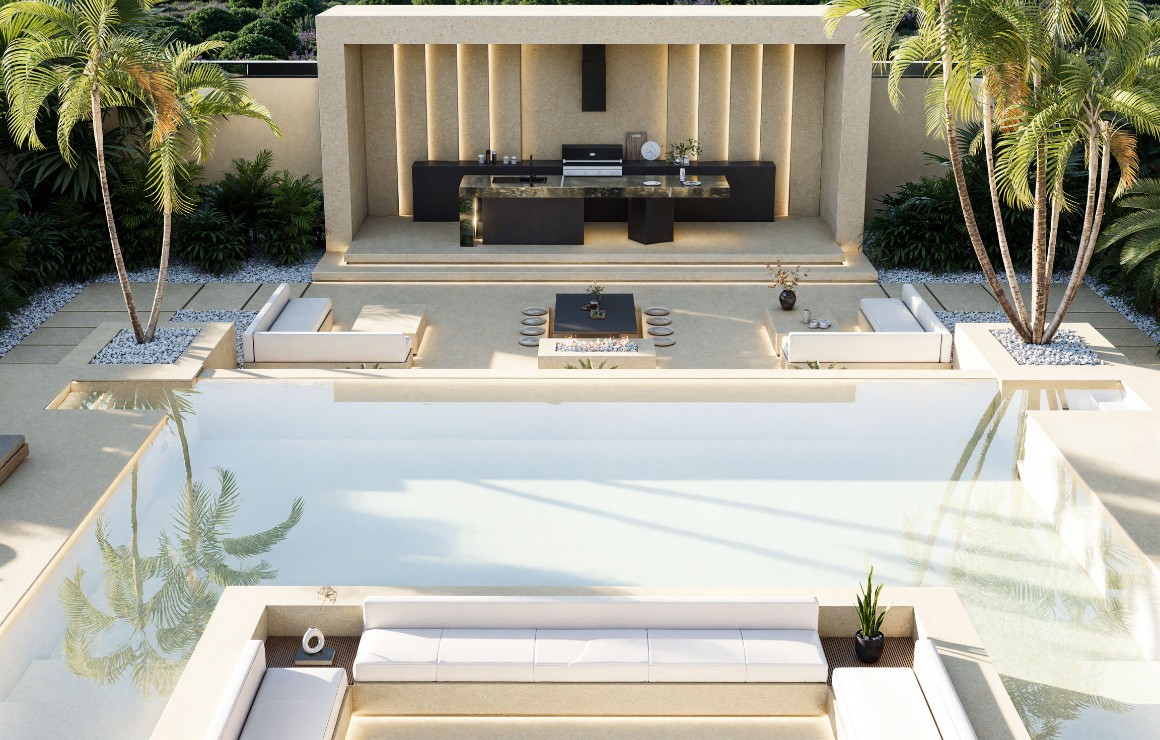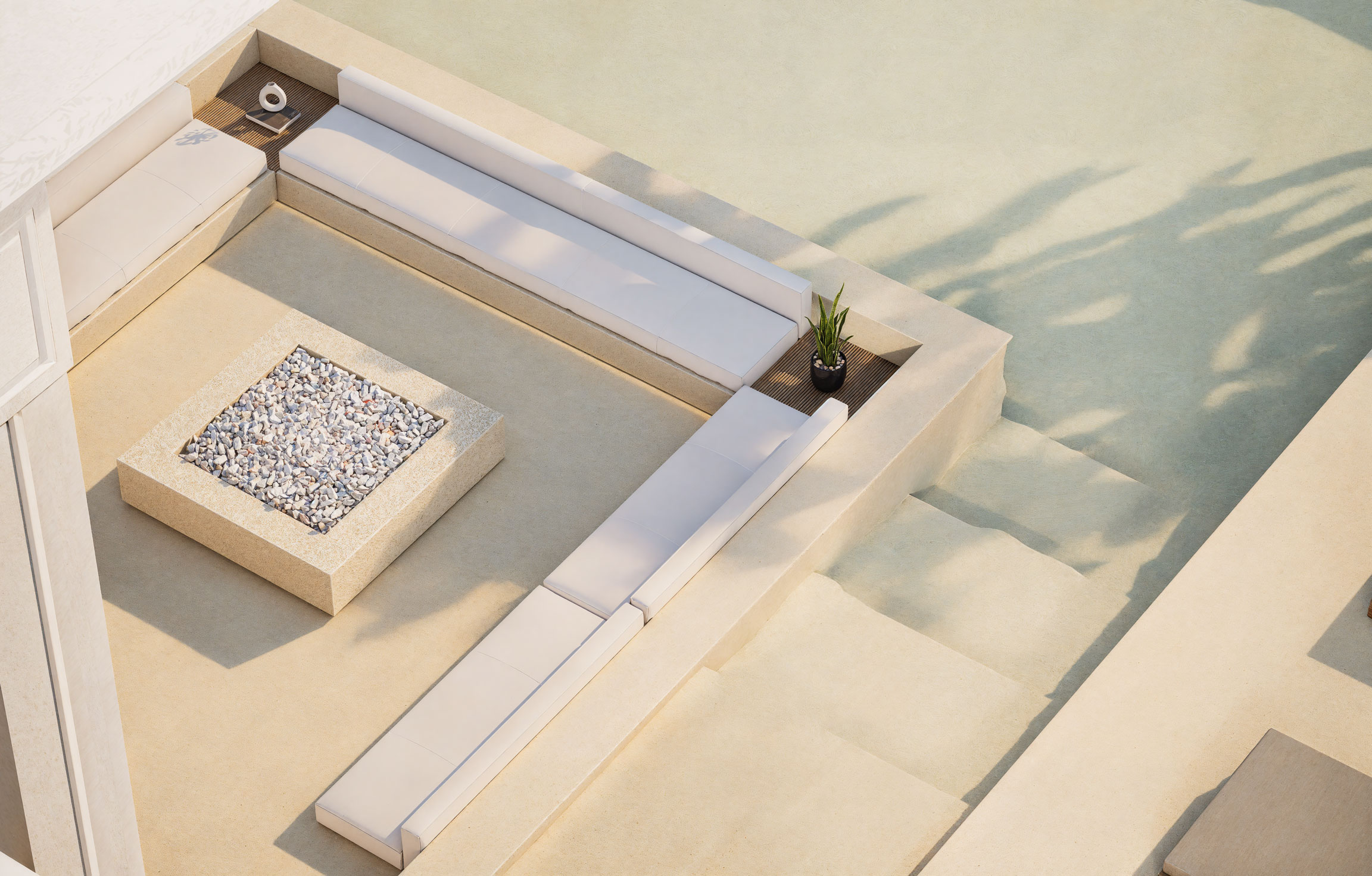 At the villa’s center, a reflective water surface captures shifting skies and soft light, turning every façade into a living canvas. This still mirror becomes both a spatial and emotional anchor, an element that draws the home into dialogue with its surroundings while embodying the essence of balance.