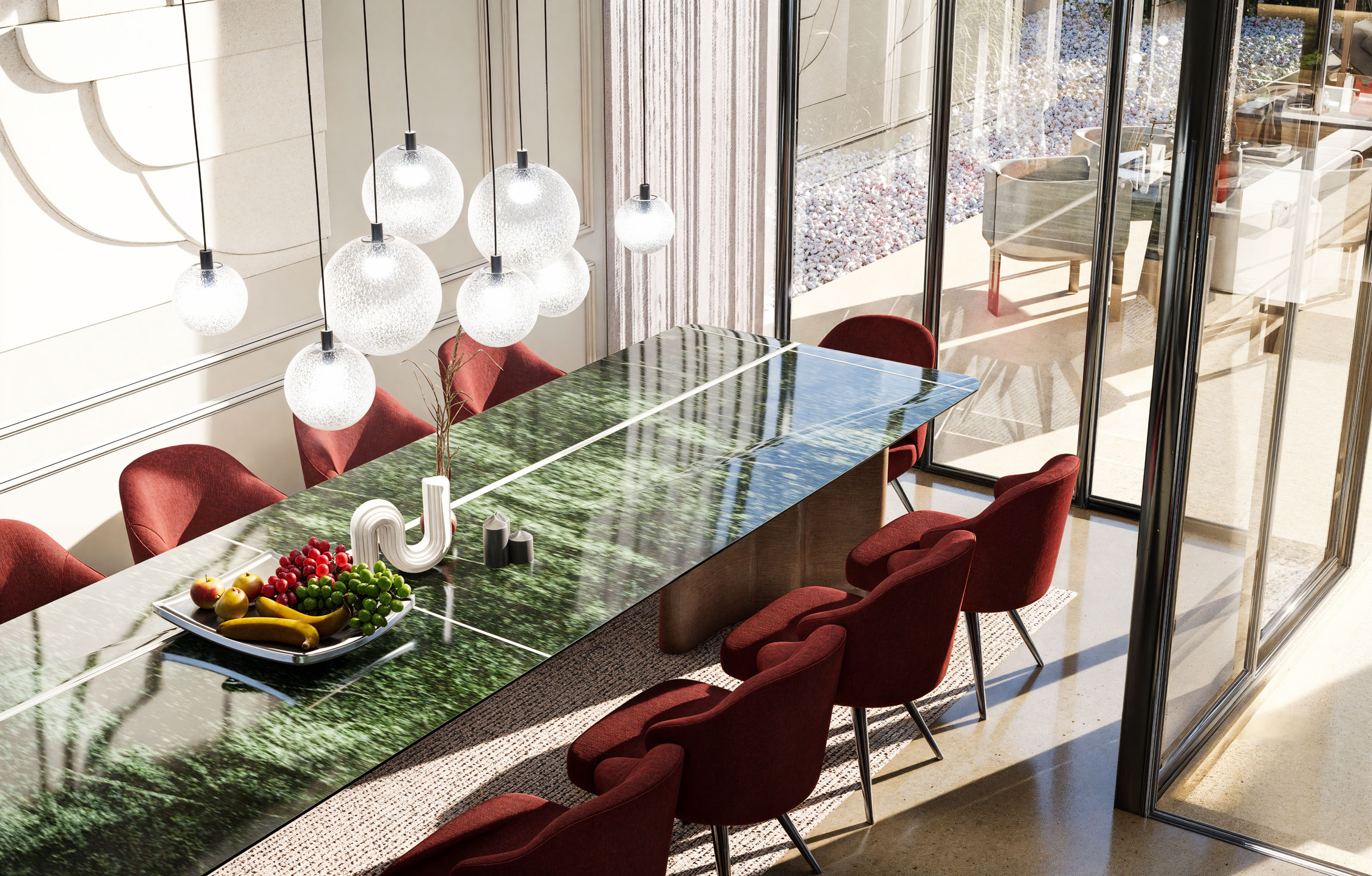 The form is anchored in white stone cladding, pure, minimal, and monumental. Its volumes extend through long cantilevers and tall elevations that evoke both lightness and authority. Dark wood inserts and travertino surfaces introduce warmth and tactility, while subtle gestures of green marble recall the mineral tones of desert flora. Together, these materials create a composition that feels grounded yet ethereal.